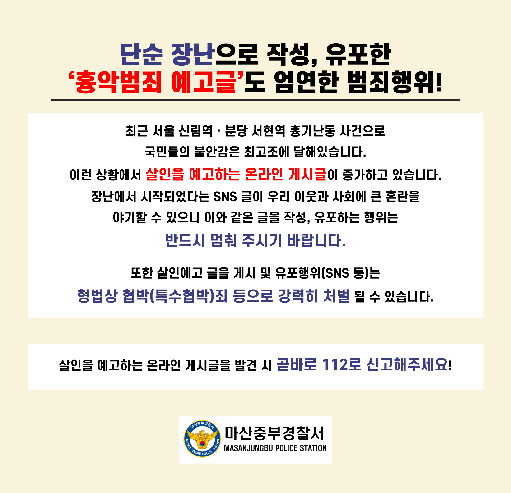 최근 서울 신림역, 분당 서현역 흉기난동 사건으로 국민 불안감이 최고조에 달해있습니다.이런 상황에서 살인을 예고하는 온라인 게시글이 증가하고 있습니다.장난에서 시작되었다는 SNS글이 우리 이웃과 사회에 큰 혼란을 야기할 수 있으니 이와