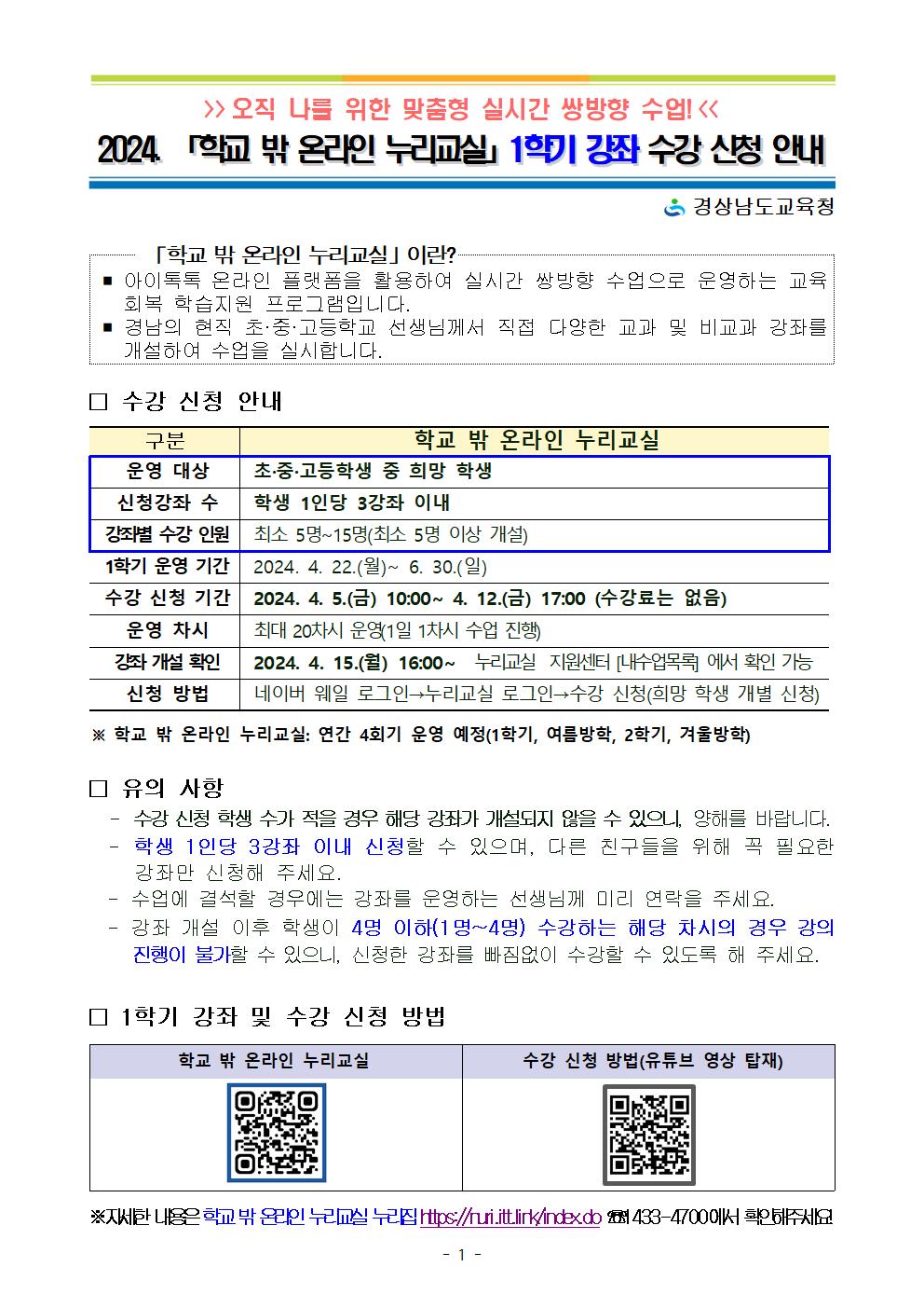 2024. 「학교 밖 온라인 누리교실」1학기 강좌 수강 신청 안내.hwp